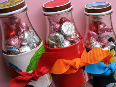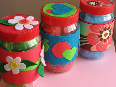 So, Valentine's Day....Instead of buying the cute but unnecessary trimmings and trappings, ribbons and wrappings from Target, I've dug into my stash of recyclable containers, fabric and paper to wrap up some little gifts for the fam. I didn't try anything elaborate or time-consuming, just wrapped, taped and glued some pieces to these jars.