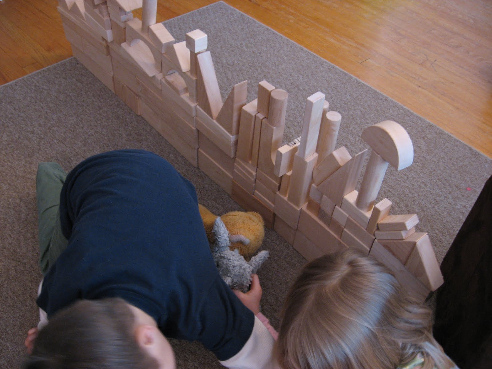 My parents got our children a wonderful set of blocks for Christmas and they've been in almost constant use since. I'm always amazed at the uniqueness of each structure they design. They've built car washes, race tracks, parking lots, houses with furniture and people, elevators, grocery stores, towers with well-concealed hiding places and tunnels, walls, giant people, windows, castles, random abstract structures, and on and on. Most often other toys are involved, which I totally understand. Someone small enough has to have the pleasure of being inside these awesome buildings.